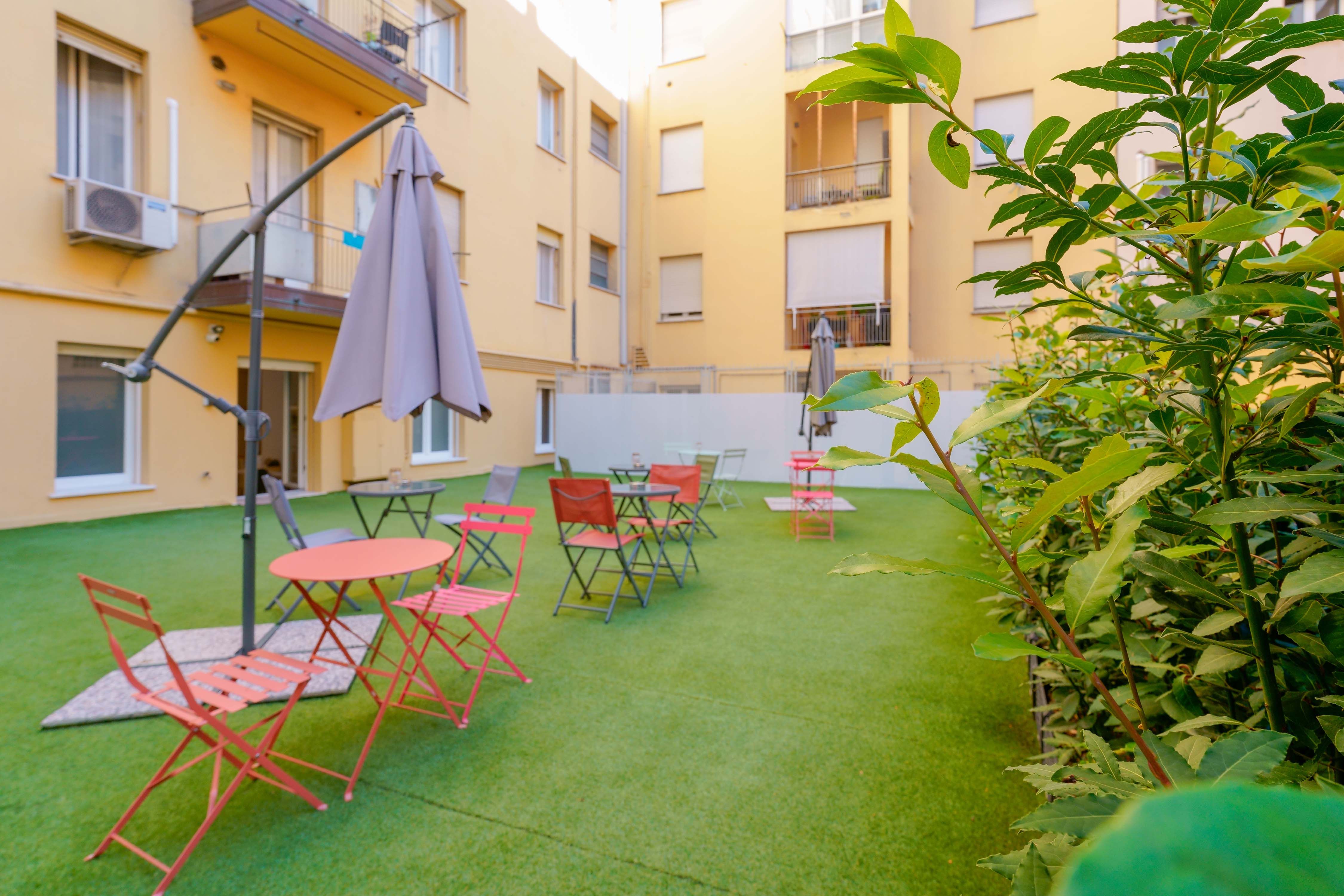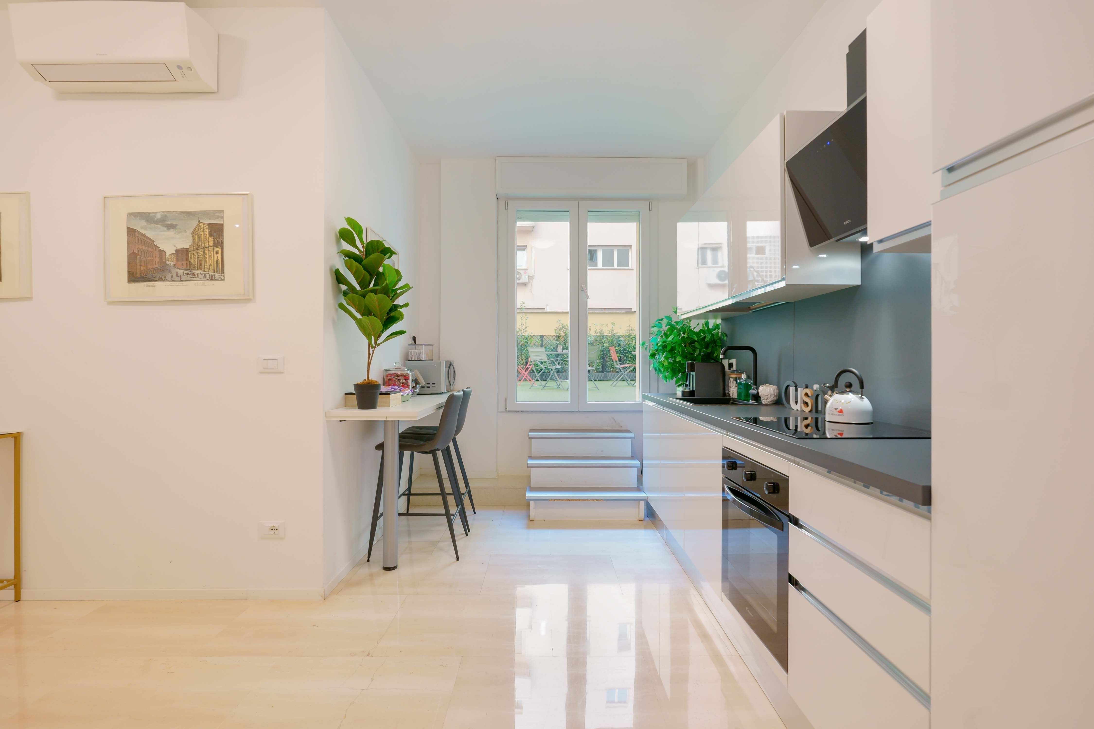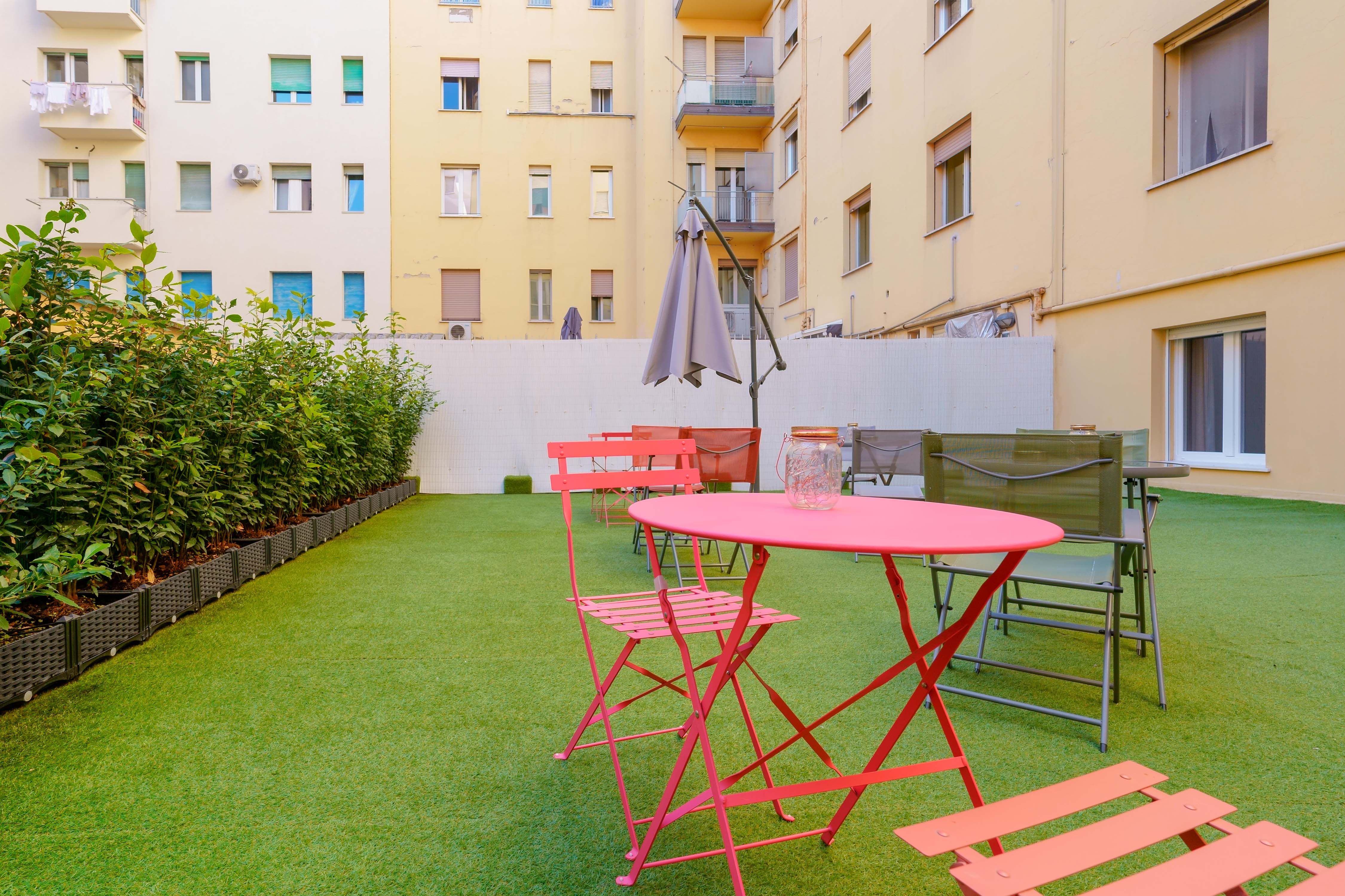Die angrenzende Terrasse ist eine Oase der Ruhe, ideal, um einen Kaffee zu trinken, ein Buch zu lesen oder einfach nur an der frischen Luft zu entspannen. Die helle und einladende Umgebung lädt zu geselligen Momenten, Entspannung und Inspiration ein und macht jeden Aufenthalt zu etwas Besonderem.